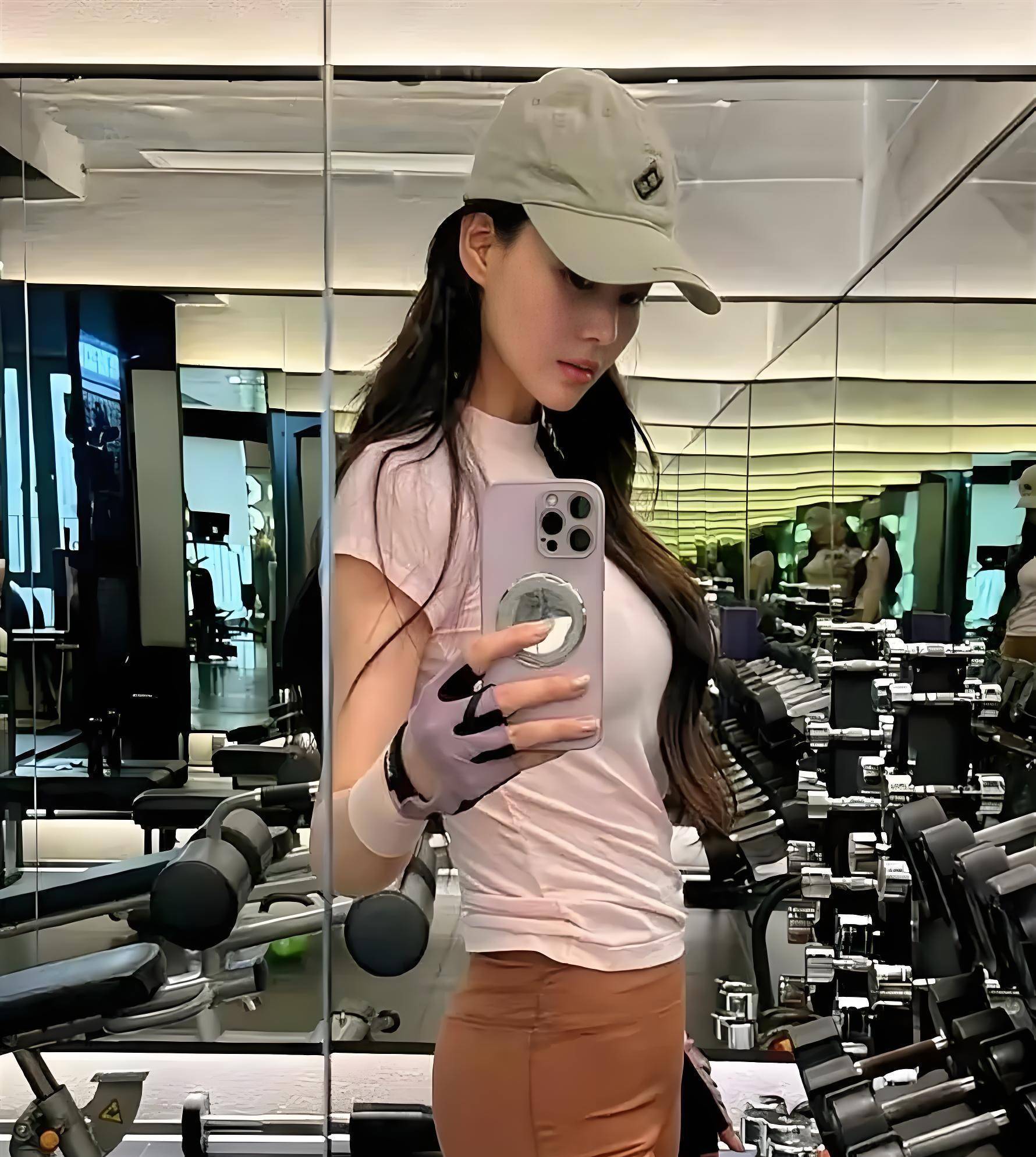 白色棒球帽下,完全未施粉黛的脸庞反而透着生命力。没有粉底遮盖的皮肤依旧细腻,苹果肌饱满,唇色是运动后自然的红润,巴掌大的小脸在汗水映照下,下颌线清晰得像用尺子画过。最绝的是她掀起灰色紧身衣的瞬间:马甲线深刻如雕刻,腹部平坦紧实,侧腰曲线利落分明,连大腿到小腿的肌肉线条都长直匀称,没有一丝松垮。